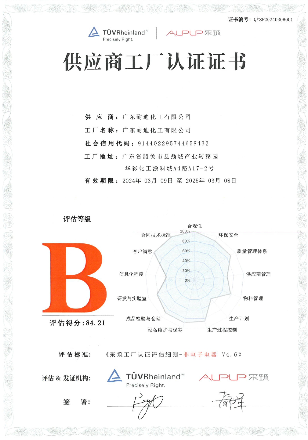 近日,国际独立第三方检测、检验及认证机构德国莱茵TÜV大中华区(以下简称“莱茵TÜV”),向广东耐迪化工有限公司(以下简称“耐迪斯”)颁布了由其依照《采筑工厂认证评估细则-非电子电器V4.6》制定的供应商工厂认证证书。
